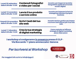 Una serie di incontri dedicati alla formazione pratica con esperti e consulenti specializzati: i workshop si terranno in presenza all’interno della sede di CLP dalle 9.00 alle 13.00, sono gratuiti e vi si accede tramite iscrizione online (per iscriversi, clicca qui).