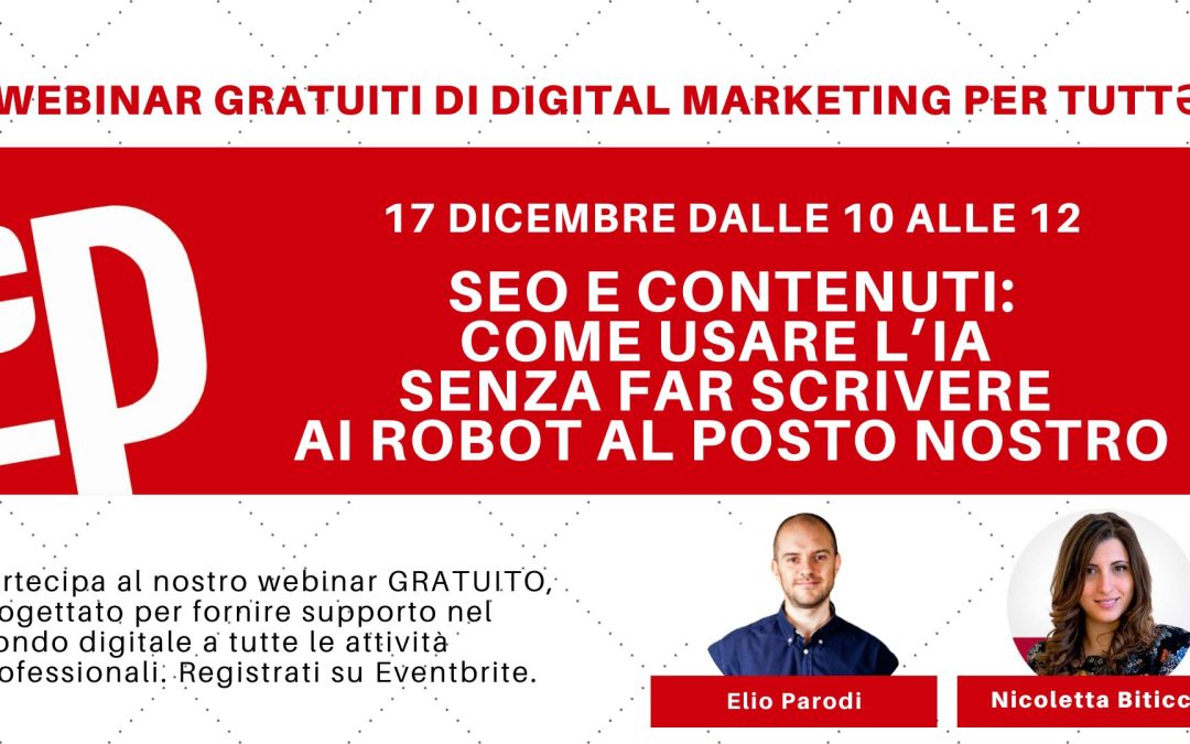 Un webinar che mette insieme due mondi che oggi convivono – a volte bene, a volte malissimo: la SEO fatta come si deve e i contenuti creati con l’intelligenza artificiale.